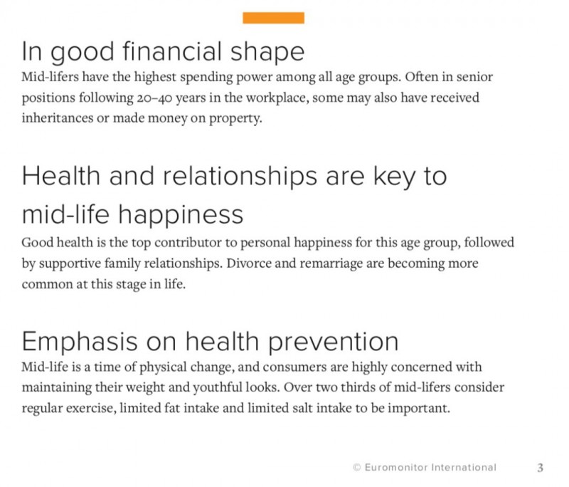 虽然常常被营销人员所忽略,但不得不说占据全球人口16%的中年人群仍是消费市场中的一股中坚力量。而大多数中年人也都面临着一些生活现实:从抗衰老到体重管理等健康问题,到婚姻、事业等家庭、职场问题,他们更迫切地需求在生活中找寻真实的自我,实现人生价值。欧睿国际的报告指出,中年人群主要具有以下特征:财务状况良好、消费能力高,健康和家庭关系是他们幸福的关键,尤其注重健康预防等。