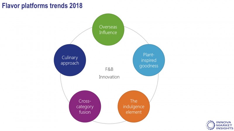 在2018年,零食品类最具有洪荒之力的风味趋势是什么?Innova Market Insights给出了5大关键词:异域风情、植物之益、烹饪的借鉴、跨界融合以及纵享。