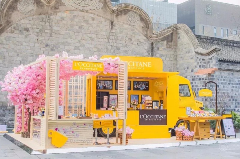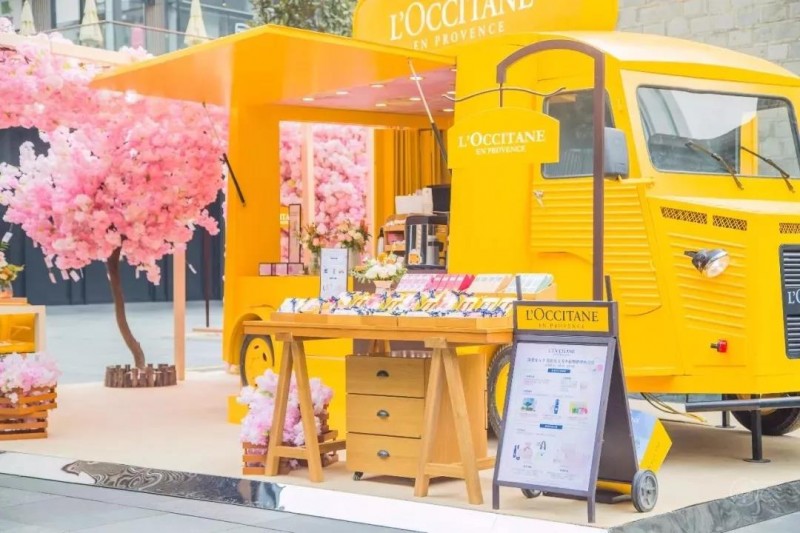 造型复古的大卡车,正面改装成大大的橱窗,琳琅满目地摆放着各种护肤品和外卖咖啡,背面则是樱花新品海报。
