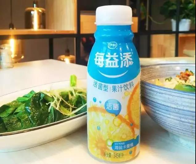 2017年6月,伊利每益添家族推出了一款活菌型果汁饮料,这款新品提出“果汁+活菌”新概念,是饮料业内的首款活菌型果汁饮料,共有海盐卡曼橘和海盐青苹果两种口味,售价6元,突破了单一品类的局限,开创了一个新的细分品类。