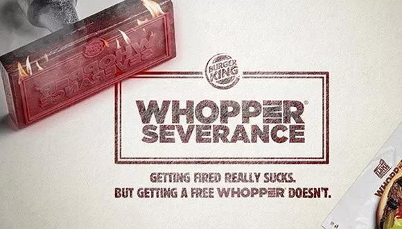2017年8月,汉堡王用火玩了个谐音梗——英语里“炒鱿鱼”(get fired)和“明火烧烤”(fire grilled)差不多。如果不幸失业,可以在领英上发布“I got fired. I want a free whopper. #WhopperSeverance(我被解雇了,给我一个免费皇堡)”就能收到一封来自汉堡王的慰问邮件,附上一张抵用券,可以申请免费皇堡套餐。