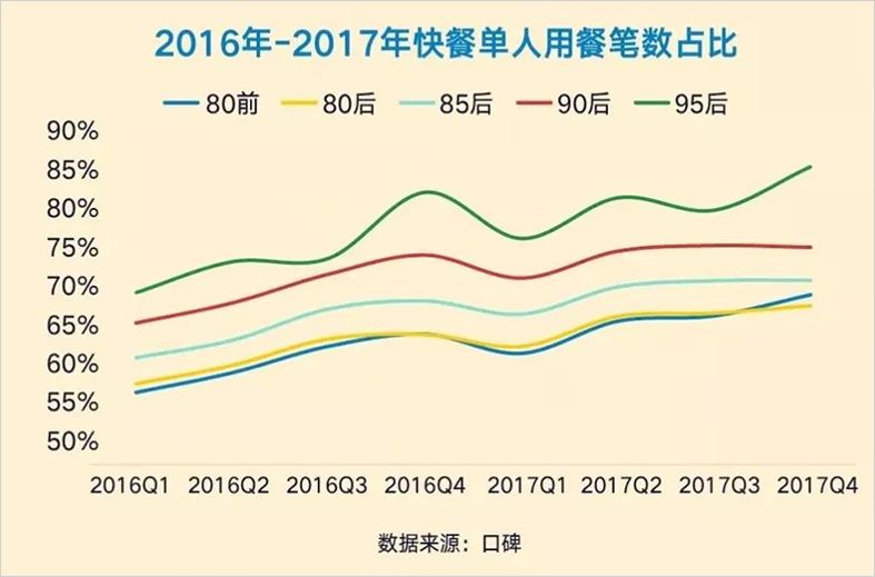 △ 各年龄段单人用餐的消费笔数占比均呈现上升趋势,95后更为明显