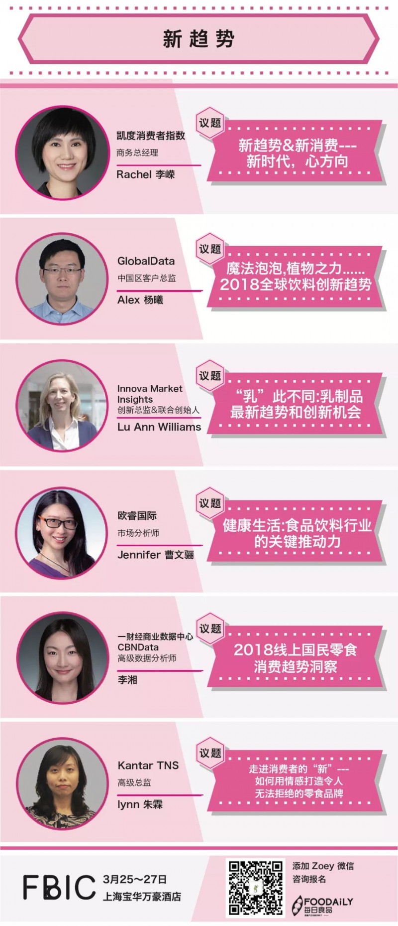 刚刚步入新的一年,对于未来这一年有怎样的预测?食品饮料行业将会出现什么样的潮流、新趋势呢?在“2018全球食品&饮料创新品鉴(FBIC)”活动中,来自凯度消费者指数、GlobalData、Innova Market Insights、欧睿国际、第一财经商业数据中心、凯度TNS等的嘉宾将会从不同角度对新一年的消费趋势、品类创新方向等进行深度分享,希望能够为企业提供前瞻性的思路,对2018年食品饮料行业的可能性有预见性的了解。