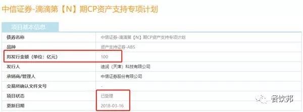 今晚,基金君查询上海证券交易所公司债券信息平台发现,中信证券—滴滴第【N】期CP资产支持专项计划已于3月16日受理,此计划拟发行金额100亿,品种为资产支持证券-ABS。