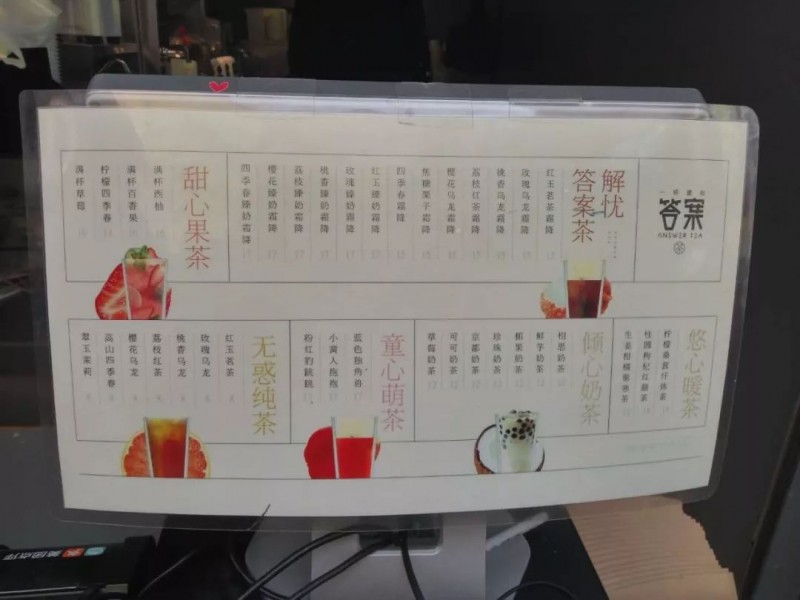 我也拍了一张菜单,可以看到,产品单价在8~17元之间,纯茶、果茶、奶茶、奶盖茶都有,但能占卜——在奶茶上显示出答案的只有两个奶盖茶系列。
