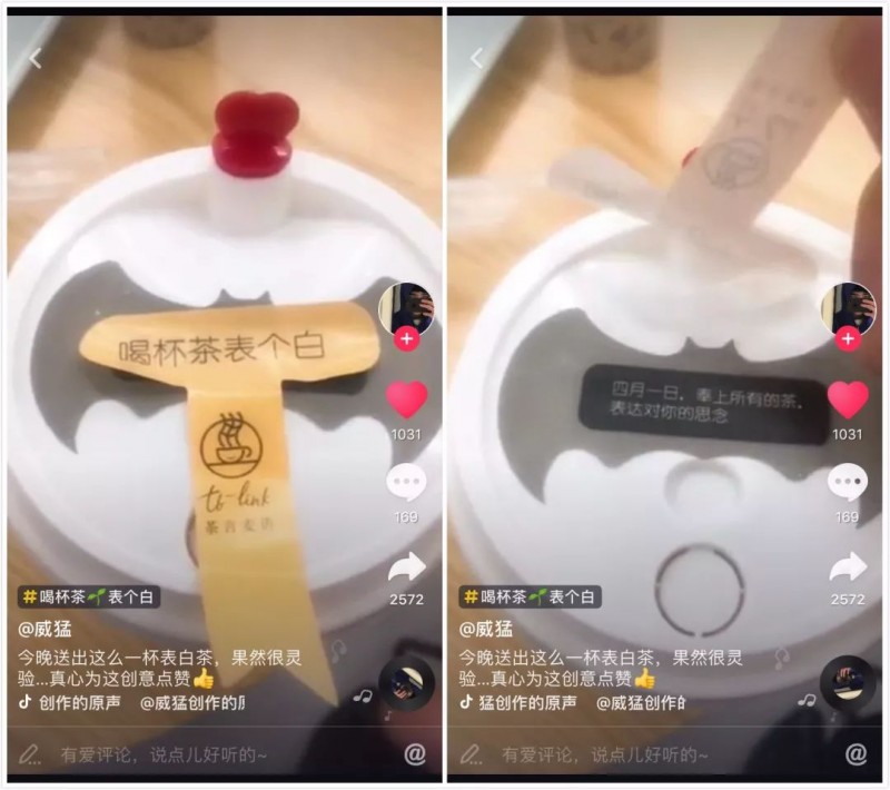秘密就藏在茶言麦语的杯盖上!掀开其蝙蝠状的封条,一条条暖心的正能量文案便展现在客户面前。其独特的产品属性和新兴的玩法,很快引起了消费者的注意。不少网友看完抖音的视频纷纷表示要“人肉”这杯茶,因为茶言麦语给了他们一个表白的新玩法!