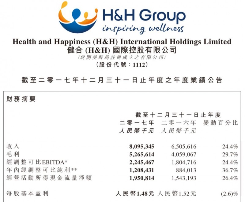 昨日晚间,健合国际控股有限公司(1112.HK)公布的业绩数据显示,2017年,该集团收入达80.95亿元,同比增长24.4%,调整可比经营利润22.46亿元,同比增长24.4%,经调整可比纯利12.08亿元,同比增长36.7%。