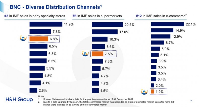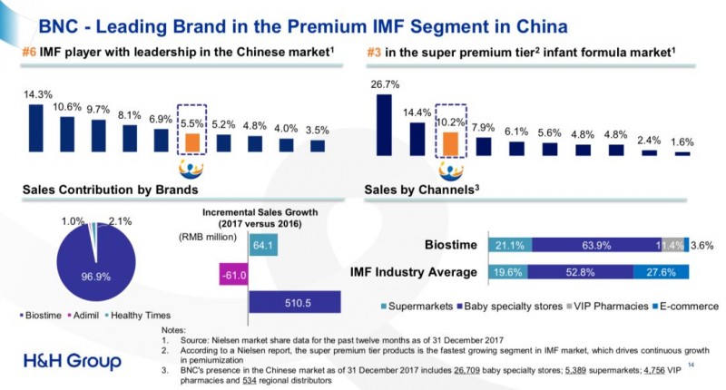 其中,其赖以起家的婴幼儿配方奶粉业务仍然是该集团收入贡献最大的一个品类。小食代翻阅财报看到,受益于婴幼儿配方奶粉与益生菌的强劲增长,2017年集团的BNC业务收入为46.81亿,相较于2016年增长了22.5%,占总收入约57.8%。