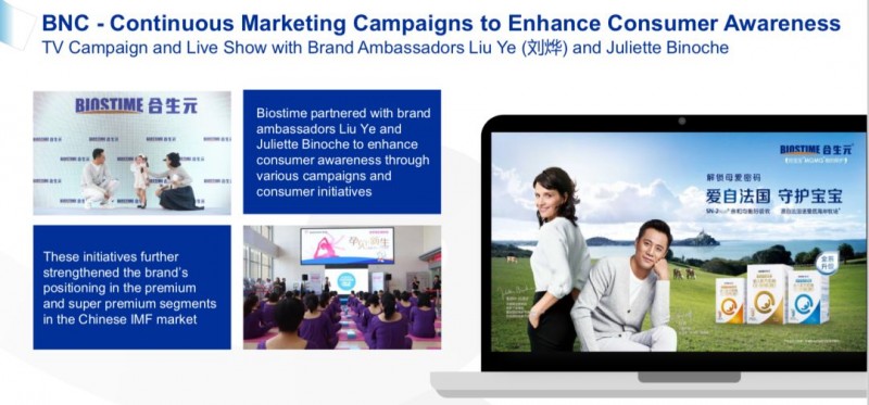 去年,在品牌推广方面,该集团签约了中国“三金影帝”刘烨和法国影坛巨星朱丽叶·比诺什(Juliette Binoche)担任Biostime合生元的品牌大使。