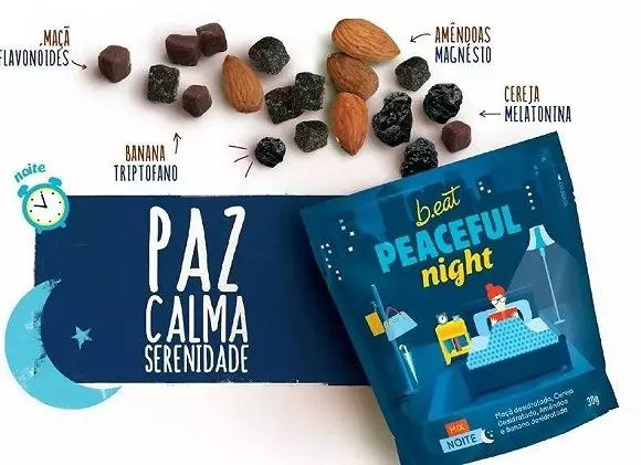 还有巴西No Tom Ind. Com. Imp. Exp.de Alimentos(B.eatfood)公司生产的夜间坚果零食,采用脱水苹果、樱桃、香蕉和巴旦木等原料。产品包装明确告诉你,它想营造一个放松和减压的夜晚。