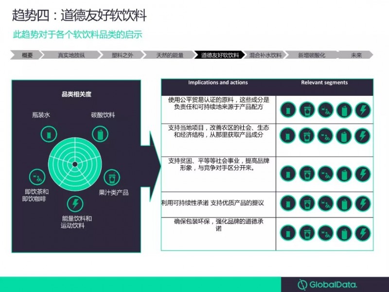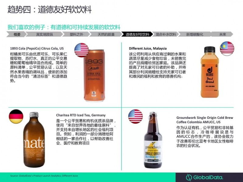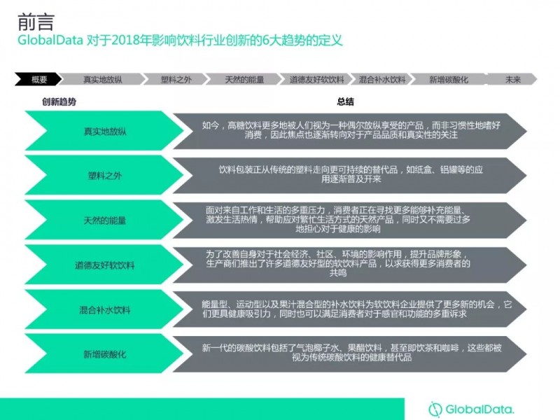 以上六个趋势就是GolbalData通过2017年3个季度做的消费者调研,为我们带来的2018年全球饮料创新趋势分析。我们看到未来促使消费者购买软饮料主要因素除了口感、安全、健康外,更多的增加了对能量、产品的创新性和道德友好等方面的需求。同时,千禧一代已成为软饮料最大的潜在消费者,年轻人通过社交媒体能够得到很多信息,所以“潮”和“科技感”也是未来饮料或食品发展的必备因素。
