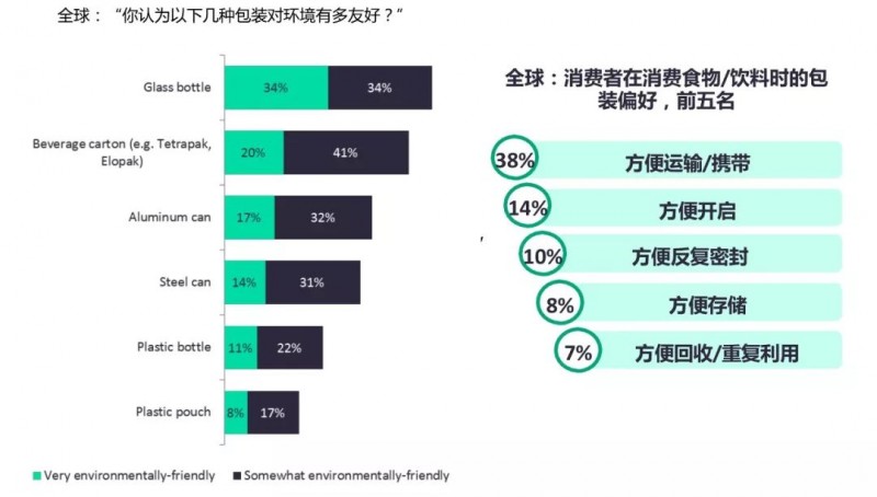 ▲ 全球消费者心中的包装环保程度,以及消费者对于食品/饮料包装的前五种偏好(数据来源:GlobalData)