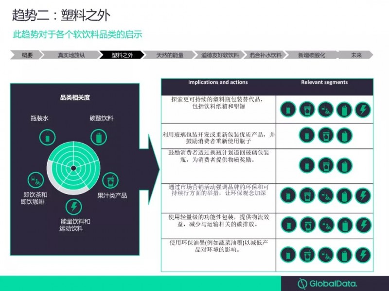 实际上,塑料瓶的确是造成塑料废物的主要原因之一,英国政府承诺在2042年底前根除所有可避免的塑料废物,中国紧缩进口洋垃圾,全球主要国家都在针对塑料污染制定应对方案。所以无论是从环保还是企业持续发展的角度,利用可再生、可回收、替代材料和减少材料重量等方式进行产品包装都是软饮料行业发展的必然趋势。同时,生产商必须确保这些包装替代品易于运输,开放和重新密封,以与塑料瓶的实用性相媲美。