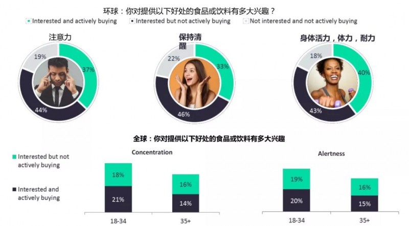 在18-34岁的消费者中,有39%对提高注意力和活力的饮料有兴趣,他们意识到不平衡的生活方式给心理健康带来了消极的影响。而千禧一代希望有一些产品能够帮助他们放松和恢复。事实上,57%的千禧一代已经购买或考虑购买此类天然能量产品。因此,相比于老一代的人,年轻的消费者对功能性产品更感兴趣。