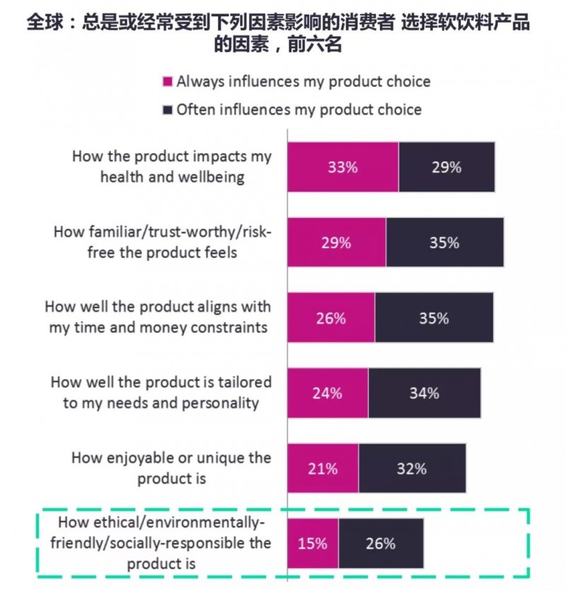 消费者越来越认识到道德和可持续性的重要性,因为全球75%的消费者认为,为了创造幸福或健康的感觉,以道德或可持续的方式生活是重要的。其中,不同年龄段消费者对不同因素的考虑优先级有很大差异。老年人主要关注产品是否健康,而年轻人关注其是否环保。因此,虽然可持续性目前是软饮料选择中的次要因素,但是一旦可持续性需求充分确立,其影响将变得越来越重要。