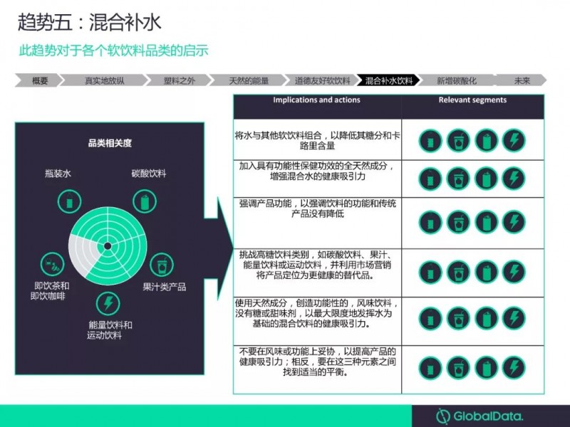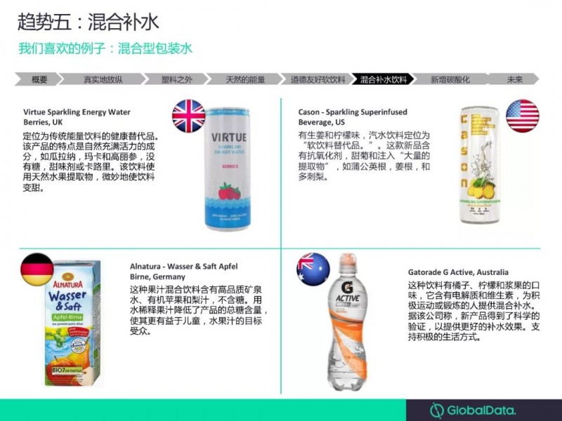 这是软饮料发展的一个重要方向,因为混合补水产品在保持健康的同时又提供了更好的风味和口感。水品牌有机会将水与其他饮料类别结合起来,创造出混合的、跨界的产品,比如能量水、运动水、碳酸水和果汁注入水都正在普及。