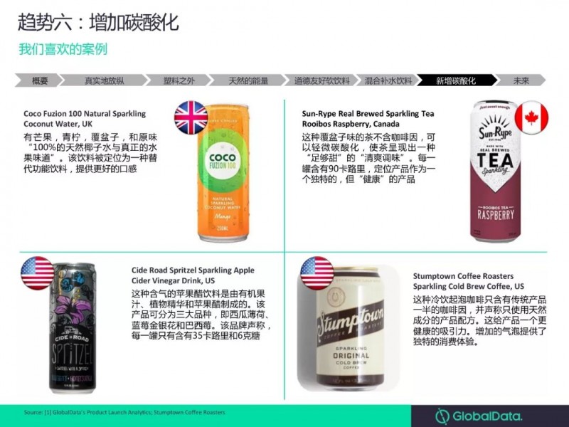新一代碳酸饮料包括起泡椰子水、醋饮料,甚至是RTD茶和咖啡,它们都被定位为“有益健康”的CSD替代品。这些饮料可以推动传统的CSD消费下降的下一个阶段,同时重新定义CSD的概念。