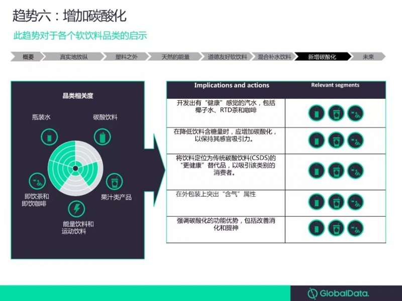传统碳酸饮料市场销量的下降为新型的“含气饮料”提供了巨大的市场机会。虽然包装水在全球人均消费量方面已超过碳酸饮料,但碳酸化这一类别仍然非常受欢迎。碳酸饮料在软饮料行业中的流行,正鼓励许多其他软饮料类别自己开发出起泡的饮料,以获取传统碳酸软饮料(CSD)的销量。