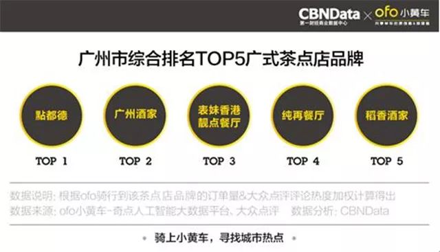 ofo小黄车出行大数据显示,在广州用户最爱的茶饮品牌中,网红店“点都德”荣登榜首,“广州酒家”紧随其后排名第二,“表妹香港靓点餐厅”、“纯再餐厅”、“稻香酒家”分别位居广州茶点品牌的第三至第五名。