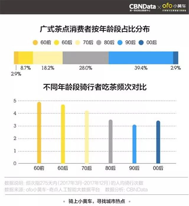 不过,虽然60前和60后用户只占整个消费年龄段的11.6%,但消费频次高于80后和90后约40%,证明60年代群体对广式茶点消费偏好更高。