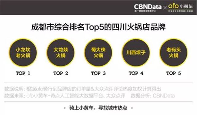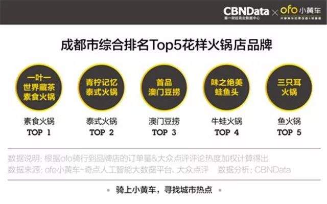 在成都花样火锅品牌中,根据ofo小黄车出行大数据显示,“一叶一世界藏式素食火锅”位居第一位,最受骑行者喜爱。“青柠记忆泰式火锅”位居第二位,“首品澳门豆捞”、“味之绝美蛙鱼头”、“三只耳火锅”依次位列第三至第五位。