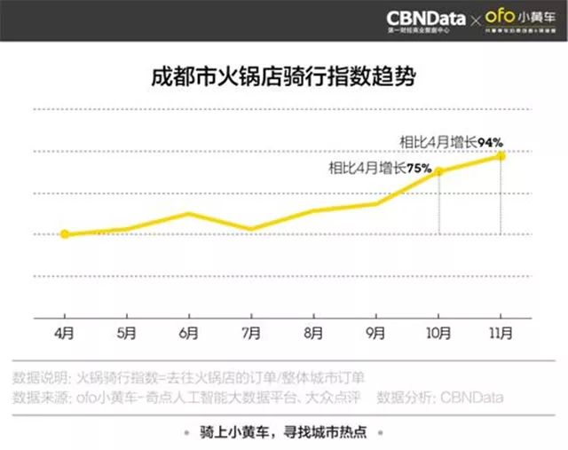 据ofo小黄车出行大数据显示,10月、11月火锅店的出行订单量相较于4月份分别上涨了75%和94%。而且,吃火锅的时间段多集中在中午,并持续到晚上8、9点。