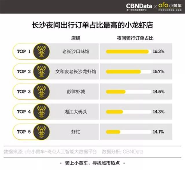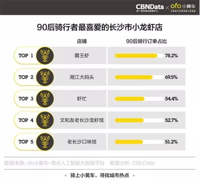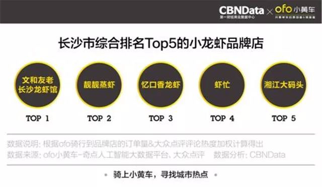 据ofo小黄车出行大数据显示,在长沙的小龙虾餐饮品牌中,“文和友老长沙龙虾馆”位居小龙虾消费出行的榜首,“靓靓蒸虾”位居第二位,“忆口香龙虾”位居第三,“虾忙”、“湘江大码头”分别位居第四和第五。
