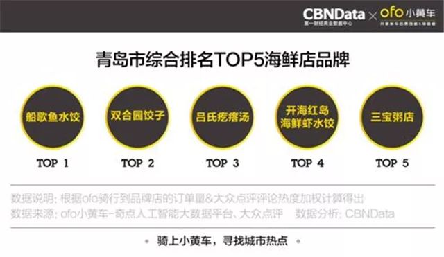 根据ofo小黄车出行大数据显示,青岛最欢迎的TOP5海鲜品牌店中,“船歌鱼水饺”位居第一,“双合园饺子”位居第二,“吕氏疙瘩汤”位居第三、“开海红岛海鲜虾水饺”位居第四、“三宝粥店”位居第五。