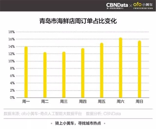 从青岛市海鲜店的周出行订单变化来看,每天的出行订单占比均在12%以上,但相比于工作日,周六、周末的订单占比更高,周订单在周六达到最高峰。