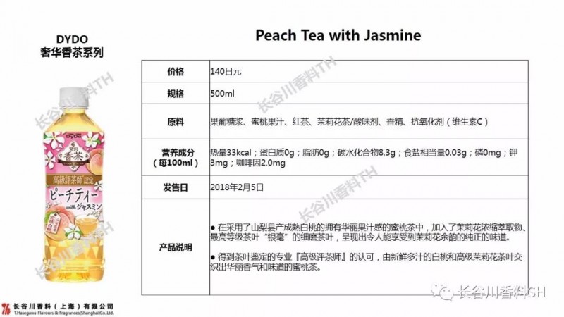 山梨县产的成熟白桃制成的果汁加入茉莉花萃取物,以及高级茶叶“银毫”的细磨茶叶。该产品受到了“高级评茶师”的认可。