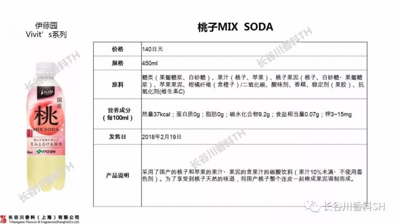 选用日本国产的桃子+苹果果汁、果泥的果味碳酸饮料。将整个桃子带皮制成的果泥,让人更能享受到桃子的天然果味。