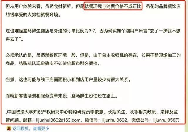 《爱范儿》此前曾评价盒马线下店体验“如抽丝般杂乱而消耗耐心”,中国政法大学特约研究员就曾专门撰文指出:(盒马)就餐环境与消费价格不成正比,确实如个别用户所言“去了一次就不想再去了”。