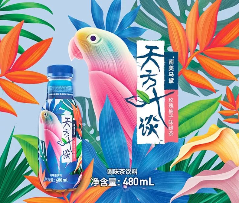 玫瑰柚子味绿茶选用南美马黛茶,包装上以七彩神鸟为主。