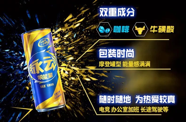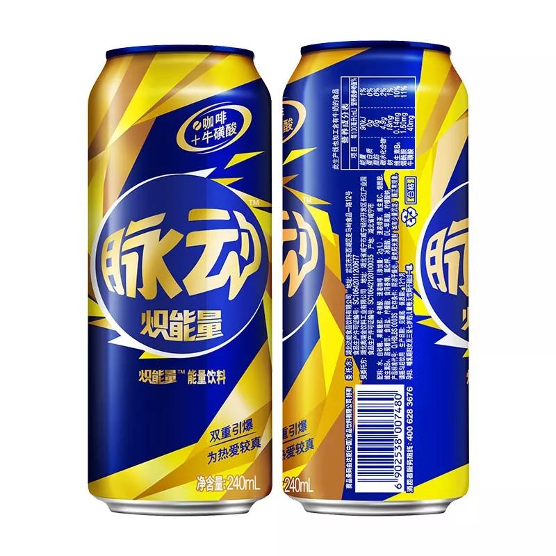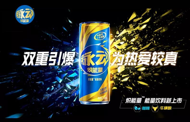 脉动炽能量能量饮料是脉动2018年全新推出的能量饮料产品,此产品区别于去年推出的炽能量运动饮料,产品添加咖啡与牛磺酸,对标市面上红牛、乐虎等主流能量饮料品牌。包装设计上采用更加时尚的摩登罐,画面上采用了具有咖啡+牛磺酸象征意义的颜色元素,更加年轻化。