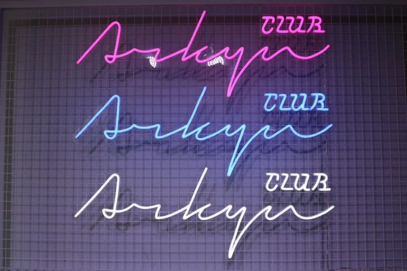走出这几间房间,沿着刚刚的走廊往对面走,会经过一个霓虹灯墙。
