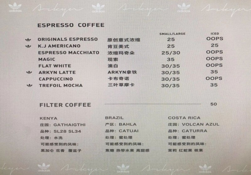 拍完照片就可以下楼打印海报了,等待海报印出来的时间,可以用手环在点餐区换一杯限定咖啡。咖啡的出品由 AUNN CAFE 负责,保持了稳定的水准,菜单上带有 Adidas 三叶草 LOGO 的四种饮品(意式浓缩、美式、拿铁、摩卡)都可以免费领取。