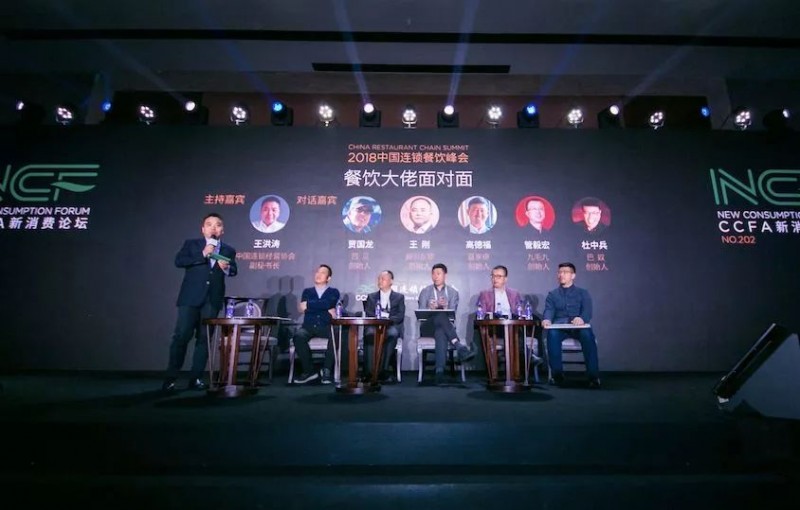 左起:中国连锁协会副秘书长王洪涛、西贝创始人贾国龙、眉州东坡创始人王刚、喜家德创始人高德福、九毛九创始人管毅宏、巴奴创始人杜中兵