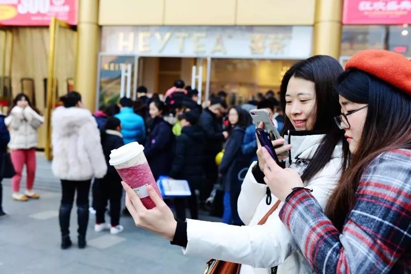 2018年元旦,网红奶茶“喜茶”在南京的新店开业,两位美女在店前拍摄刚刚购得的奶茶。图@视觉中国