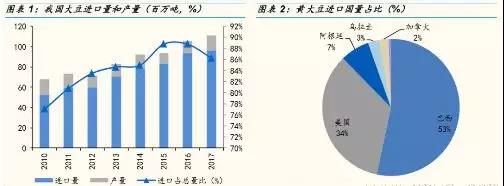 由于我国大豆产值效率较低,而进口大豆成本优势明显,国内消费的大豆中近90%来源于进口。我国2017年进口大豆约9600万吨,其中进口自美国的黄大豆量占总进口量的34%,美国为我国第二大豆进口国。