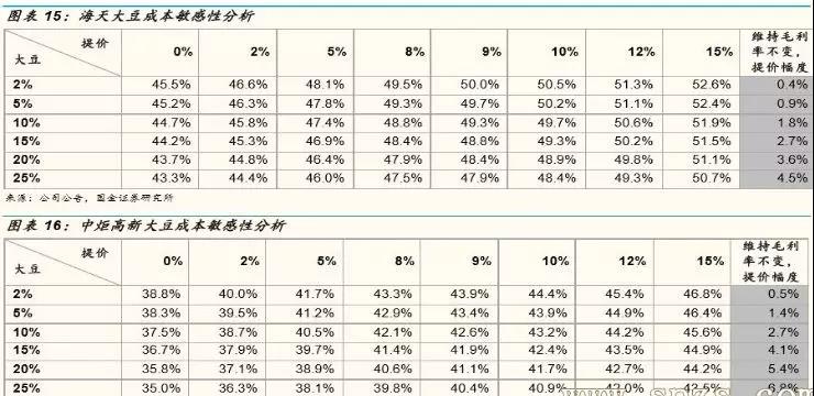 海天味业:当大豆成本分别涨价5%、15%、20%,则只需提价 0.9%、2.7%、3.6%,可保持毛利率不变。