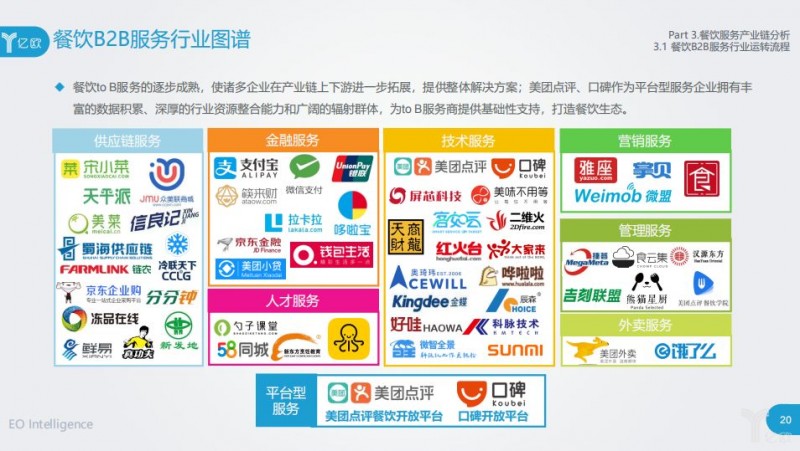 餐饮to B服务的逐步成熟,使诸多企业在产业链上下游进一步拓展,提供整体解决方案;美团点评、口碑作为平台型服务企业拥有丰富的数据积累、深厚的行业资源整合能力和广阔的辐射群体,为to B服务商提供基础性支持,打造餐饮生态。