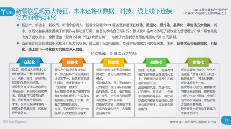 当前餐饮服务的数据积累和分析能力仍较弱,线上线下经营相割裂,软硬件智能化方向仍在探索。未来,新餐饮还将在数据化、科技化,线上线下一体化的方向继续深入发展。