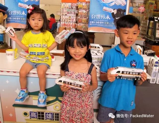 台湾铁道故事馆与台铁合作,推出普悠玛号、太鲁阁号、自强号、微笑号等4款火车造型矿泉水,许多人以为是火车模型,小朋友爱不释手。(吕素丽摄)