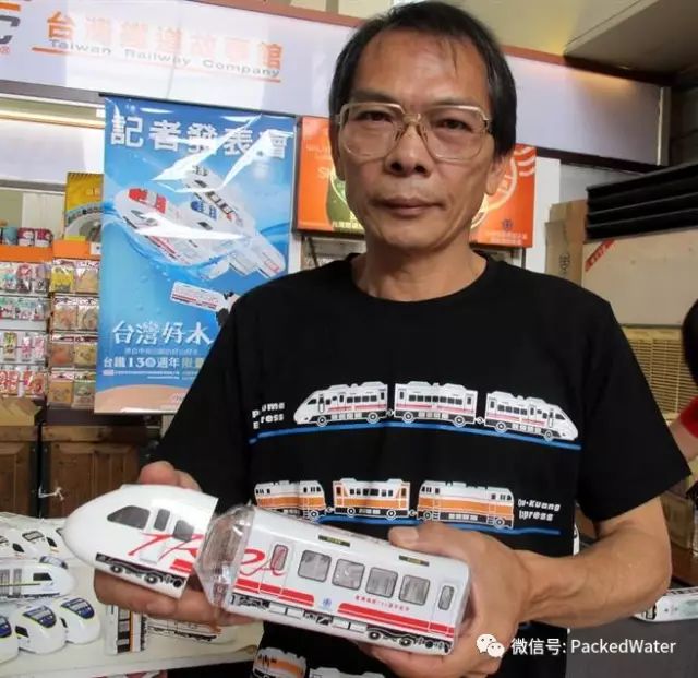 台湾铁道故事馆执行总监何元富今天上午在高雄火车站秀出火车造型矿泉水,引起许多旅客围观,有民眾原先以为是火车模型,知道是矿泉水,直呼「好有创意!」。