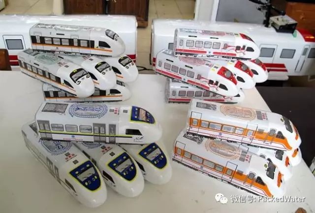 台湾铁道故事馆与台铁合作,推出普悠玛号、太鲁阁号、自强号、微笑号等4款火车造型矿泉水,看起来像火车模型,网路预购热卖。(吕素丽摄)