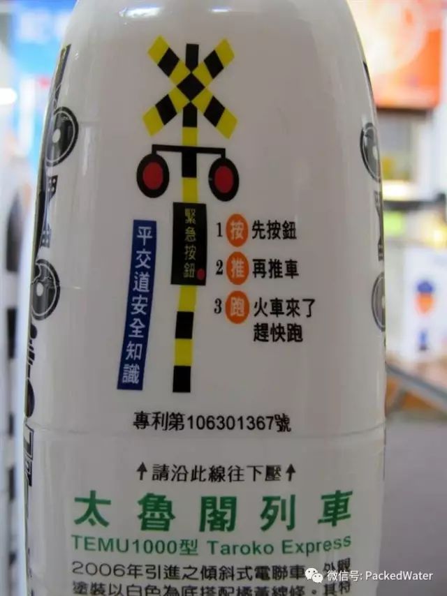 台湾铁道故事馆与台铁合作,推出火车造型矿泉水,瓶上印有平交道安全知识。(吕素丽摄)
