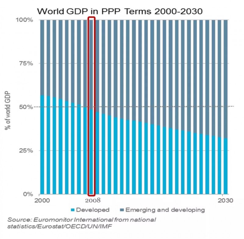 深色的柱状图代表新兴经济体,目前新兴经济体发展得非常快,并且这个趋势仍在不断延续,根据欧睿国际预计,到2030年,其GDP占比将达到全球的2/3,成为世界主要经济体。