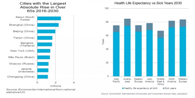 根据欧睿国际预测,到2030年,全球65岁以上人群将超过15%。在国内,“健康老龄化”这个概念已被列入十三五规划,它的推出使得中年人对推迟人体功能衰退和慢性疾病的到来有了提前预防的健康意识,这种意识正在为健康行业创造更多的需求和机会。