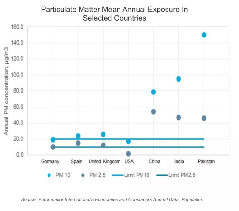 另一个外因是不断恶化的环境。比如,上图是四个发达国家和三个发展中国家空气中可吸入颗粒指数表,可以明显看出,右侧的三个发展中国家空气质量不容乐观。不断恶化的空气质量容易引发一些呼吸道疾病,也引起了人们对天然产品的关注,现在很多产品都应用了类似草本和谷物的自然元素。