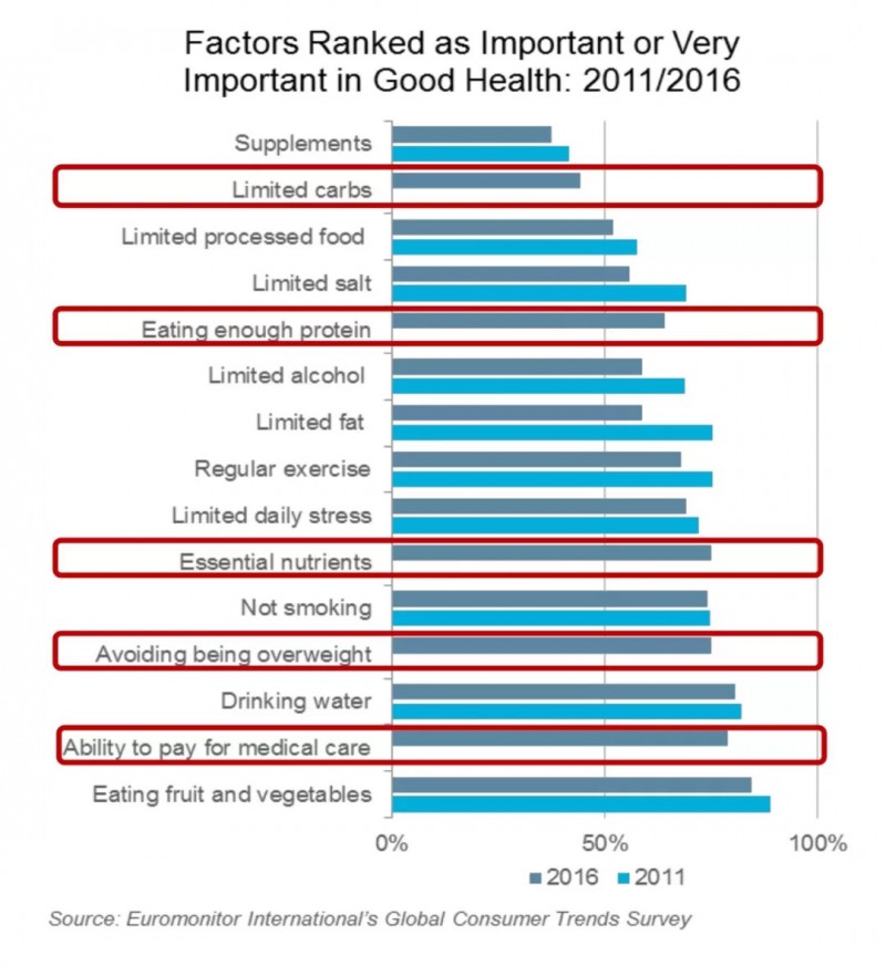 最后一个因素是生活方式的改变,它是综合前面四个驱动因素产生的一种多元化因素。欧睿国际在2011年和2016年分别对消费者做了同样的调查,让消费者列出一些他们认为的对健康有影响的重要因素。对比2011年的结果,消费者在2016年提出了更多重要因素。由此可见消费者对于健康的诉求已经越来越多元化,单一功能性已不足以满徐消费者的需求,除了身体健康,精神层面健康也越来越受到重视。